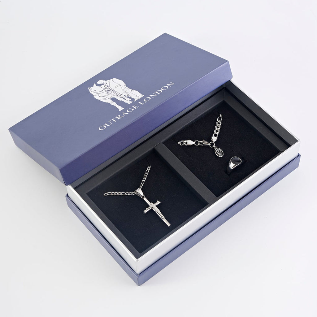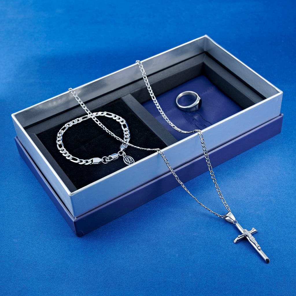 Silver Crucifix Necklace, Onyx Ring and Figaro Bracelet Set